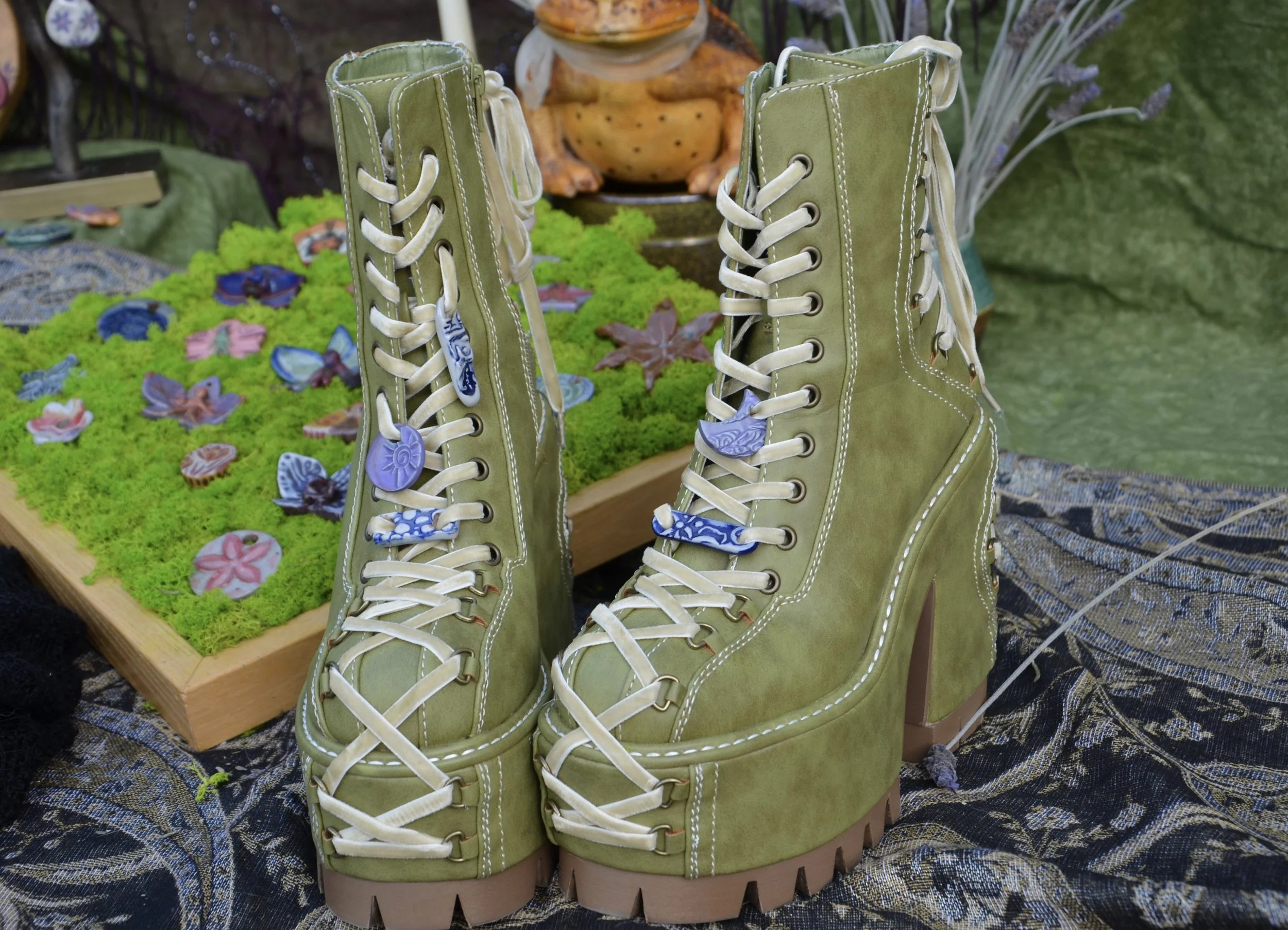 Each ceramic shoe charm begins as a small piece of clay, shaped by hand and carved with care. Once dried, it’s bisque-fired to harden the form, then painted with underglaze to add color and detail. A final glaze firing seals the surface, creating a smooth, glassy finish on both sides. This two-step firing process ensures each charm is not only visually unique but also durable and comfortable to wear. We glaze both sides intentionally — so the charm feels just as good against your fingers as it looks on your shoes.
