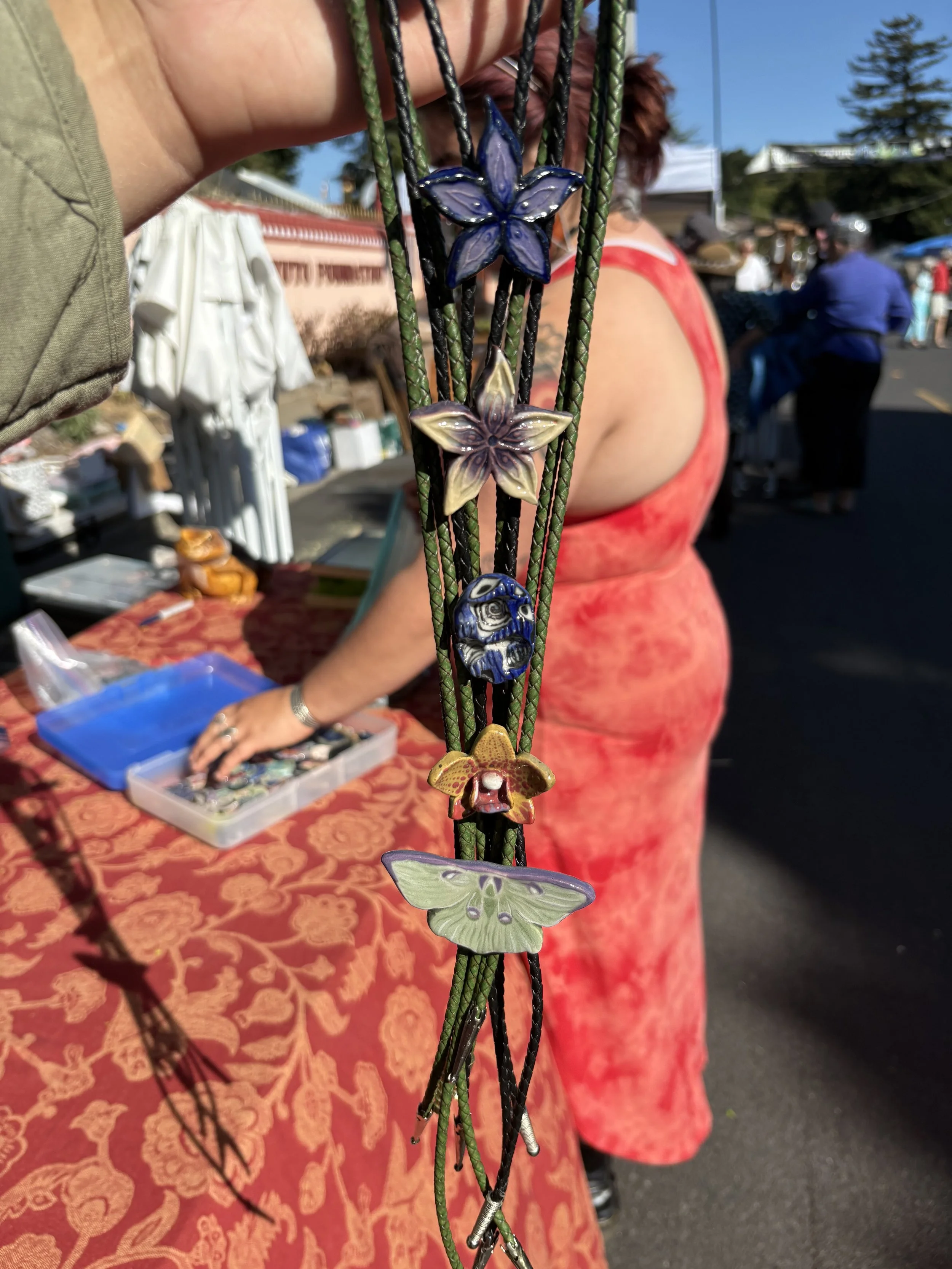 We attach bolo backings to our ceramic jewelry and add brown, green, or black vegan leather.